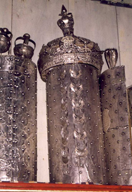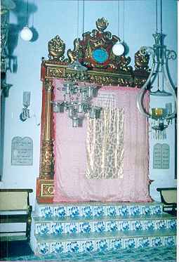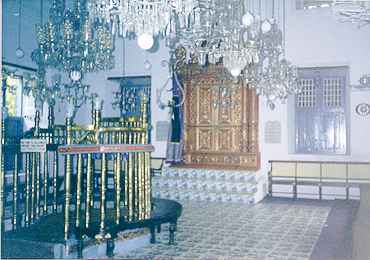 decorations. Built on land given the Cranganore exiles by the Raja and reconstructed after the Portuguese bombardment in 1662, the Paradesi is the oldest surviving synagogue in the former British Empire. White-walled and tile-roofed, with an inner courtyard lined with ancient Hebrew-inscribed gravestones, it was embellished in the mid eighteenth century by Ezekiel Rahabi, the Dutch East India Company's principal merchant and diplomat in Malabar, who built a Dutch-style clock tower with three faces: Hebrew numerals facing the synagogue, Roman numerals facing the palace and Indian numerals facing the harbor. Rahabi also had the floor paved with hand painted porcelain tiles, each with a different weeping willow pattern, brought from Canton.The synagogue shares a wall with the Raja's temple. According to a congregant, "While worshipping in the synagogue, we often hear their music and prayers, and they can hear us, too." L-R: the interior of the tiled pardesi synagogue with crystal chandeliers; the silver Torah scroll; the Tabernacle; the pulpit.The synagogue also contains silver- and gold decorated Torah scrolls; an Oriental carpet in front of the Ark (a gift from Ethiopian Emperor Haile Selassie), two brass columns commemorating pillars that stood in the Temple, two bimot (one in the women's section, a feature unique to the Jews of Kerala) and Torah crowns of solid gold set with gems given to the Cochini Jews by neighboring Rajas. The most striking feature, however, is the forest of lights hanging from the ceiling-silver, brass and glass oil-burning lamps and Belgian crystal chandeliers. In addition, the Paradesi houses 10 paintings which depict the history of the Jews of Kerala, as well as the 1,600-year-old copper plates-deposited in an iron box called a pandeal and carefully guarded by the elders - which are shown to visitors on request.