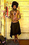 The Aghoris are a small sect. Their favourite haunt is the cremation-grounds; they bathe in cremation-ashes; and willingly transgress all ascetic (and Hindu) taboos, convinced as they are that by 'reversing all values' they will speed up enlightenment. While all sadhus are supposed to be vegetarian and teetotallers (like most Hindus for that matter), Aghoris eat meat and drink alcohol. Aghoris preferably live on cremation grounds and surround themselves with artifacts of death, like human skulls out of which they drink and with which they perform magical rituals. Nonetheless, the Aghoris represent a tradition that is thousands of years old, but their numbers have dwindled. |
