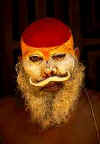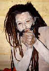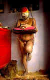Shiva is always minimally clad, which symbolizes his primal condition, his non-attachment to the world. With half-closed eyes he is immersed in meditation, in divine bliss. The Ganges springs from his long hair, his jata, as a fountain, splashing in the Himalayan mountains in the distance. The crescent -- the new moon, 'Shiva's moon' -- on his forehead, the cobra around his neck, the white bull Nandi, the river Ganges, and the full moon form a symbolic cluster which indicates Shiva's function as a fertility deity, a moon god. On his forehead are three horizontal lines, painted with ashes, representing the three main gods, the three 'worlds'. Around his neck is a garland of 108 beads, the 108 elements of material creation, and in his hand a rosary of 50 beads, the 50 letters of the Sanskrit alphabet. The two large rings through his ears are indicative of his extra-sensory perception. He is seated on a tiger skin, a symbol of power, showing his mastery over the animal world. In appearance sadhus try to resemble the gods, as they are known through ancient myths and popular legends, especially Shiva. Though Shiva is popularly known as the God of Destruction, for sadhus he is foremost the Master of Yogis. Quite a few sadhus walk about naked, symbolising their renunciation of the world of mortals, and rub their body with ashes of their holy fires, symbolic of death and rebirth. Many sadhus wear extremely long hair (jata), again in emulation of Lord Shiva, whose long strands of hair are regarded as the 'seat' of his supernatural powers.